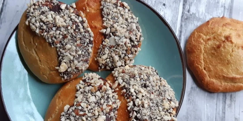Optioneel is chocolade te smelten met wat kokosolie en de helft van de koek er mee in te dippen.